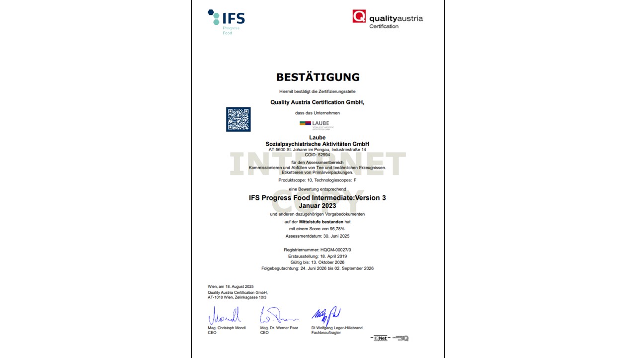 Das IFS-Audit vom 30.06.2025 wurde am 19. August 2025 von Quality Austria abgeschlossen. Mit einem hervorragenden Score von 95,78% konnte der Zertifizierungsprozess erfolgreich abschlossen werden.