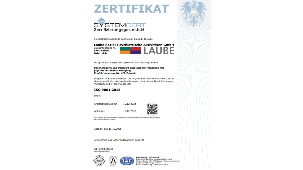 In den letzten Wochen konnte die LAUBE GmbH erfolgreich den Zertifizierungsprozess für die ISO 9001:2015 abschließen. Heute wurde uns das neue Zertifikat - gültig bis Dez. 2027 - zugesandt.
